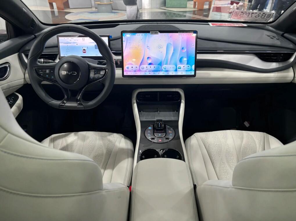 新車的長寬高分別為4630/1880/1490mm,軸距達到2820mm,尺寸數(shù)據(jù)不錯。前排座椅采用的是一體式的設計,并且是皮質材料包裹,支撐性和包裹性都不錯。因為新車采用了CTB電池車身一體化設計,所以后排的空間表現(xiàn)也不錯。