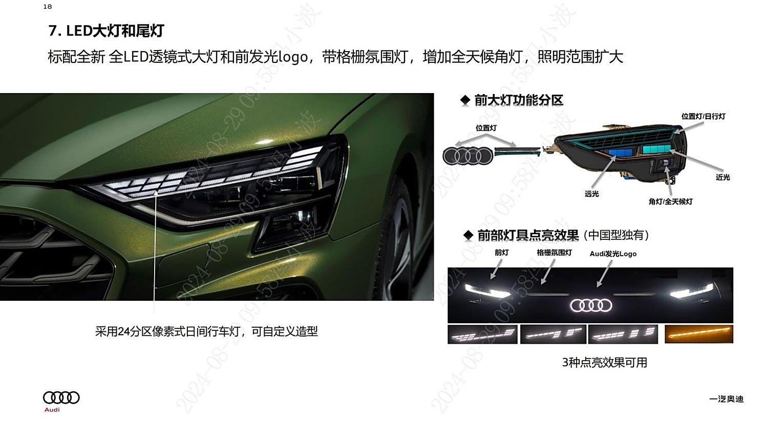 大燈造型也有不同,它的LED前大燈采用的是24像素日行燈,可以提供四種工作模式,并且用戶可以在中控屏上獨立設置。另外,新車還會配備發光的奧迪LOGO,不知道點亮效果如何,希望不會有那種汽配城的感覺。
