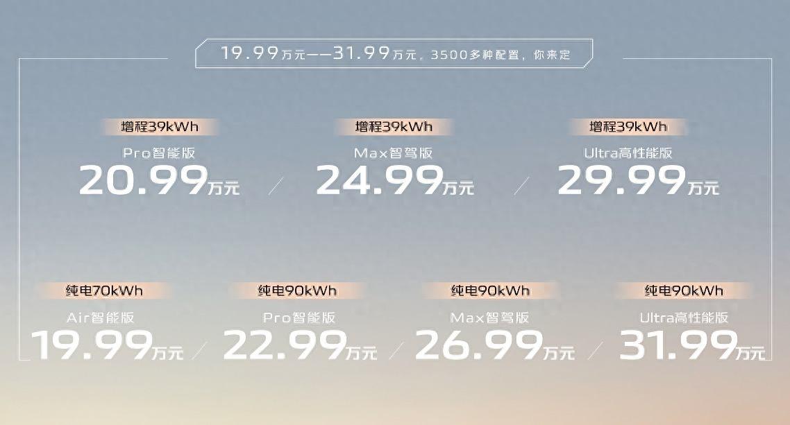 先看純電版,它擁有單電機和雙電機可選,前者最大功率252kW,最大扭矩365N·m;后者的最大功率為440kW,最大扭矩645N·m。電池方面,四款車型中除了入門版搭載的是寧德時代的磷酸鐵鋰電池外,其余車型均為中航新創(chuàng)的三元鋰電池。驅動形式上除了一款頂配是雙電機四驅外,其余都是單電機后驅。續(xù)航方面,除了入門版是70kWh的電池組外,其余都是90kWh的電池組,對應的續(xù)航分別為551km(入門版)、701km(單電機)和651km(雙電機)。