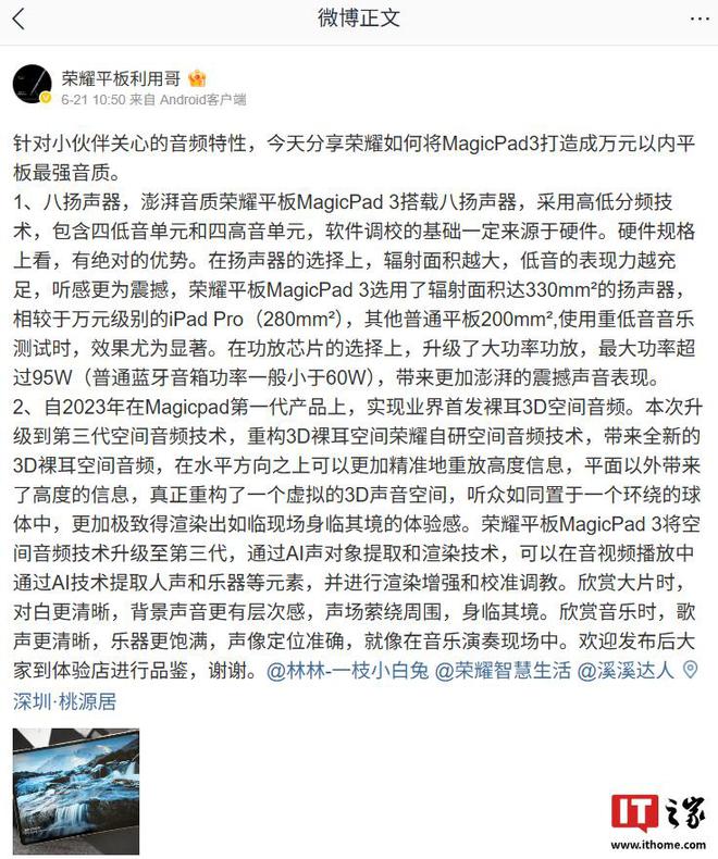 家 6 月 22 日消息,榮耀終端股份有限公司平板與 IOT 產(chǎn)品領(lǐng)域總經(jīng)理@榮耀平板利用哥 昨日發(fā)文透露了 MagicPad 3 平板的音頻特性。重點信息如下: