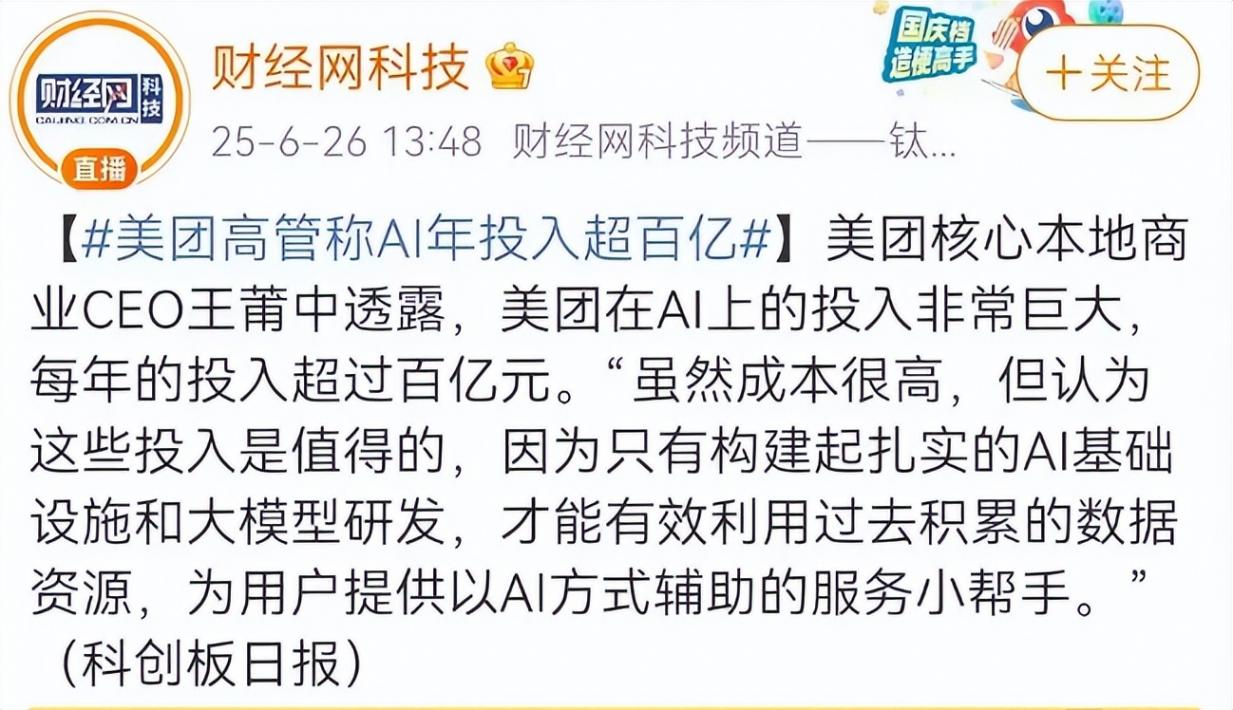 一方面,在這場(chǎng)補(bǔ)貼大戰(zhàn)之外,美團(tuán)、京東、阿里均投入重金構(gòu)建自身AI能力。