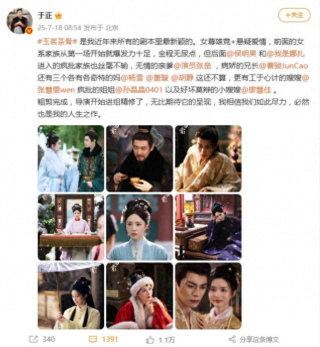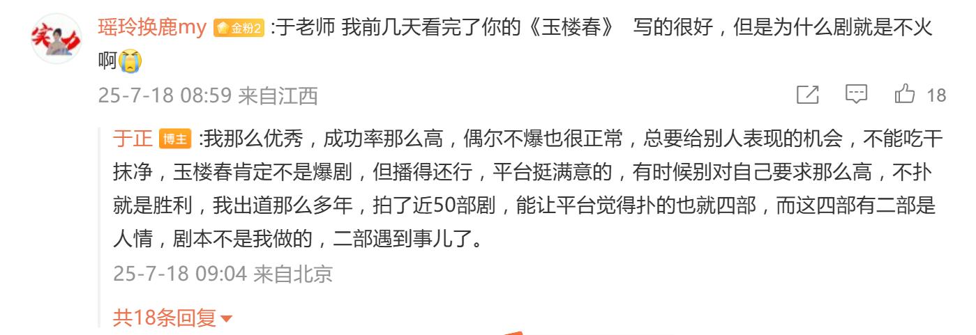 于正對自己的戰績信心滿滿,解釋那4部“撲劇”的原因也很“于正式”:要么是“人情債”接的活兒,劇本沒親自操刀;要么是演員出事、政策調整等“不可抗力”背鍋。就連被嘲“無聲無響”的《玉樓春》,他也能輕描淡寫一句“平臺滿意,播得還行”,言外之意——你們觀眾覺得不夠火?那是你們標準太高!