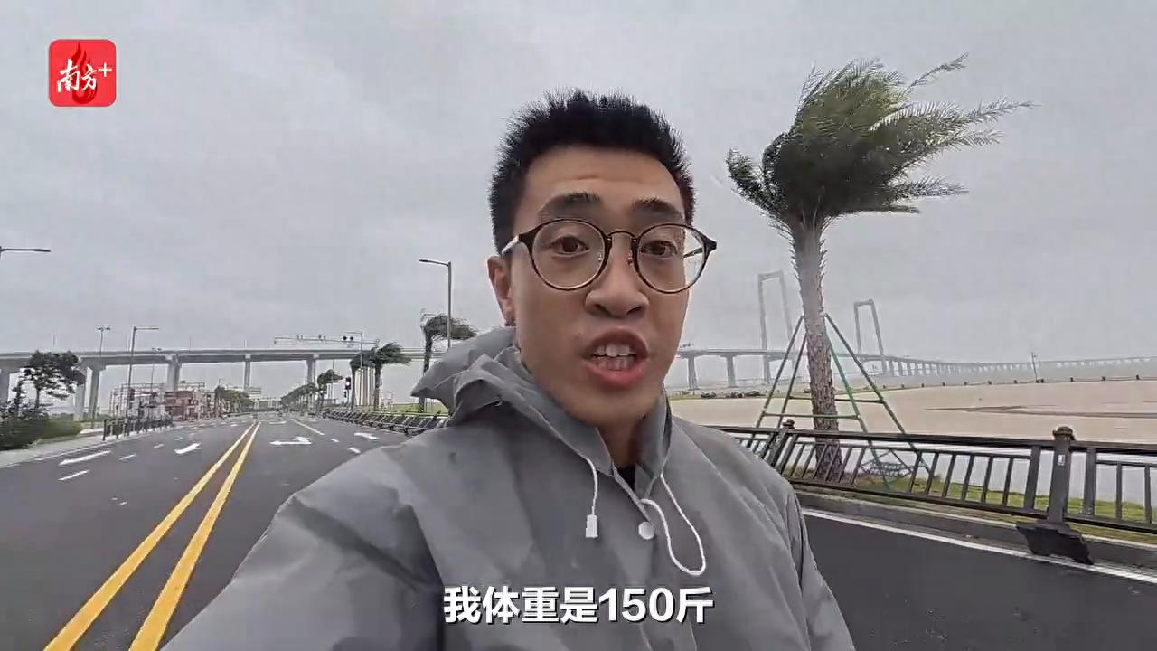 現在我在的地方是廣東中山的深中大橋,這里位于中山翠亨的岸邊。在我身后的就是深中大橋,我體重是150斤,現在剛剛還拉著一個接近30斤的箱子。但我現在走在這里已經感覺是被風往前推著走的,可以感受到的是現在的風力是非常強勁。雖然雨不大,但是可以看到周圍我身后的一些樹木已經是被吹得齊刷刷偏向了一個方向。