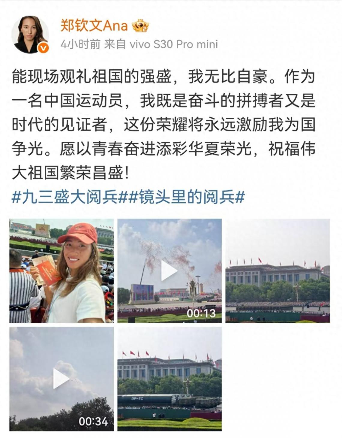 配文更是熱血沸騰:“能現(xiàn)場觀禮祖國的強(qiáng)盛,我無比自豪。作為一名中國運(yùn)動員,我既是奮斗的拼搏者又是時代的見證者,這份榮耀將永遠(yuǎn)激勵我為國爭光。愿以青春奮進(jìn)添彩華夏榮光,祝福偉大祖國繁榮昌盛!”
