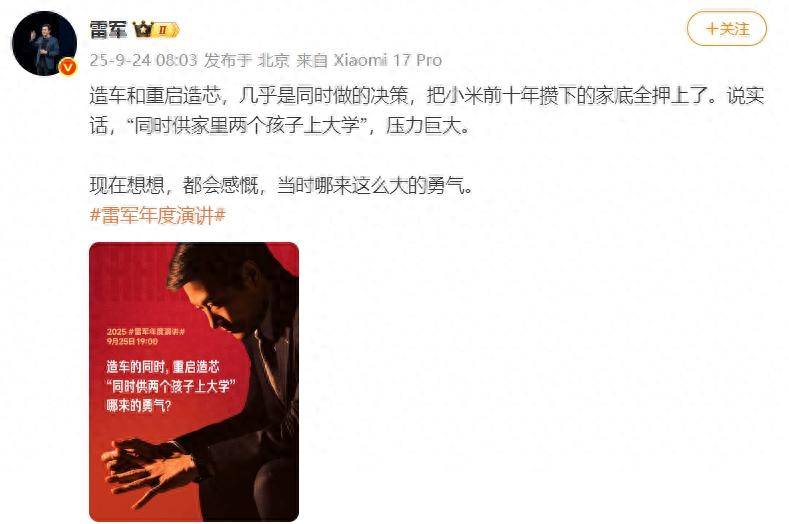 9月24日,小米創(chuàng)辦人、董事長兼 CEO 雷軍發(fā)文為“雷軍年度演講”預(yù)熱。他表示,“(小米)造車和重啟造芯,幾乎是同時做的決策,把小米前十年攢下的家底全押上了。說實話,‘同時供家里兩個孩子上大學(xué)’,壓力巨大。現(xiàn)在想想,都會感慨,當(dāng)時哪來這么大的勇氣。”