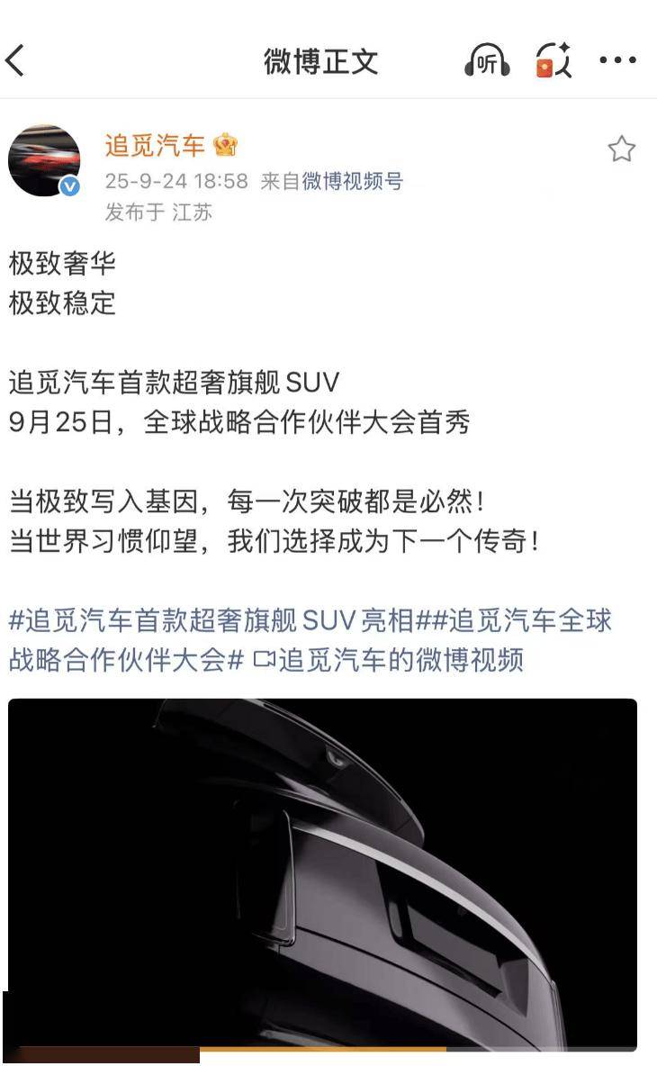 9月24日,追覓汽車今日透露,旗下第二款車輛產(chǎn)品將在9月25日舉行的首屆全球戰(zhàn)略合作伙伴大會(huì)上首秀。從外形來看,新車酷似勞斯勞斯庫里南,官方定位為家族首款超奢旗艦SUV。官方表示, “性能純電轎跑+超奢旗艦SUV” 的多產(chǎn)品矩陣將互補(bǔ),覆蓋不同高端細(xì)分市場(chǎng)需求。據(jù)悉,兩款產(chǎn)品計(jì)劃在2027年上市。