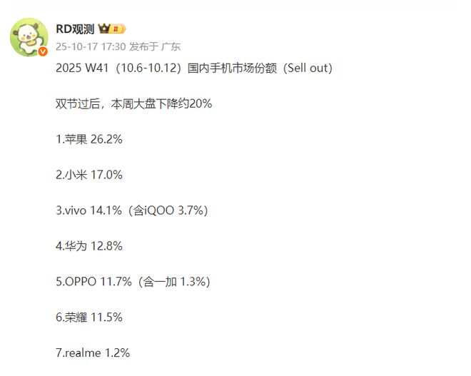 就在大家期待小米17系列持續熱賣,國內周實現三連冠之時。蘋果卻突然殺了出來,在W41周成為國內排名第一的品牌。來自行業人士“RD觀測”的數據顯示,W41周(10.6-10.12)國內市場環比下跌20%,蘋果成為這一周最大的贏家,市場份額達到26.2%。也就是這一周蘋果在國內占比超過四分之一,且26.2%創造了國內單周最高市占比。原因其實也很簡單,雙節過去之后iPhone 17系列的銷量依然火爆,且這一周的銷量可能比雙節期間還要強。有消息稱這一周僅iPhone 17 Pro Max激活量就超過60萬臺,目前iPhone 17系列在國內的激活量已經接近400萬臺。