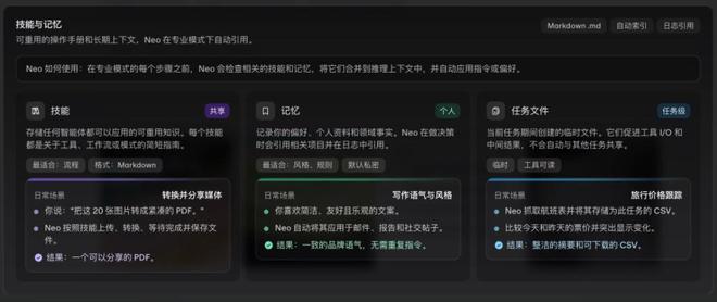 技能和記憶被統一納入到整個操作邏輯中。比如你曾保存過一個“圖轉PDF”的處理流程,或者習慣以某種語氣寫匯報文案,這些都可以被標記為技能或記憶,并在類似場景下被系統自動應用,無需重復設置。