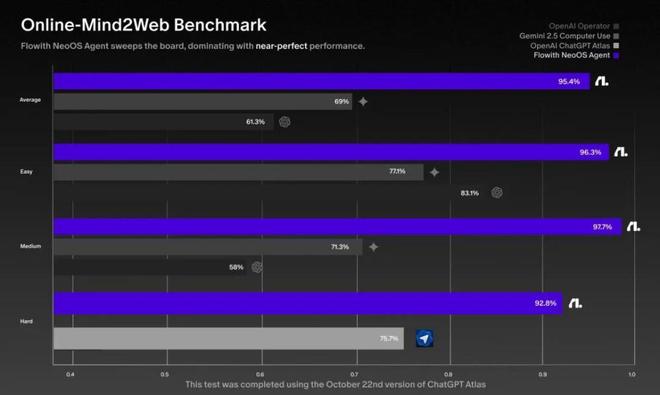 測評結果顯示,Flowith OS在Online-Mind2Web Benchmark測試的四個難度等級下全面領先,平均準確率達到95.4%,在Easy和Medium任務中分別高達96.3%和97.7%,遠超ChatGPT Atlas(平均61.3%)與Gemini 2.5(69%)等對手。