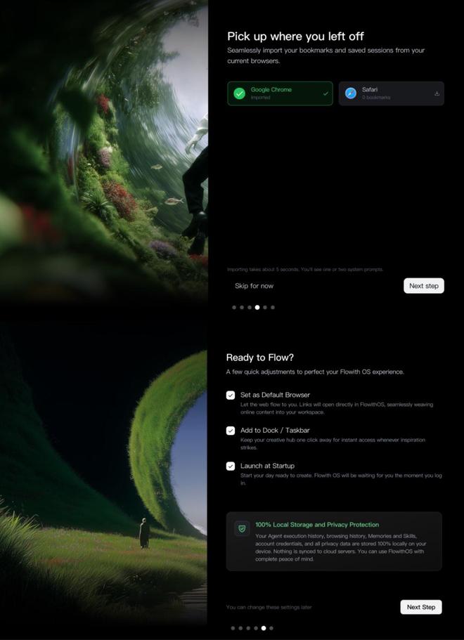 在首次啟動階段,系統會引導用戶完成一系列初始化設置,包括導入Chrome或Safari中的瀏覽記錄與標簽頁,以便無縫切換至新環境;接著用戶可選擇將其設為默認瀏覽器、添加到Dock或任務欄,并設置是否開機啟動。