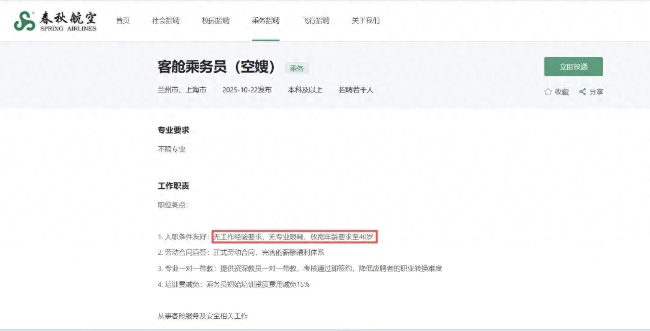 近日,春秋航空發(fā)布“空嫂”專項(xiàng)招聘引發(fā)熱議。其官網(wǎng)發(fā)布的客艙乘務(wù)員(空嫂)任職要求顯示,年齡要求為25至40周歲,已婚已育者優(yōu)先;學(xué)歷要求為全日制本科及以上;身高162cm至174cm,無工作經(jīng)驗(yàn)限制。