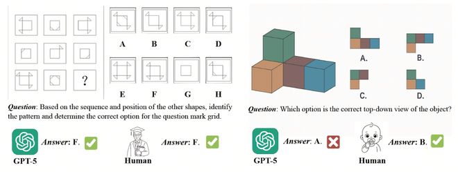例如,GPT-5可以正確解出復(fù)雜圖形邏輯題,但面對(duì)判斷立方體俯視圖這類空間題時(shí),卻出現(xiàn)了明顯錯(cuò)誤。這類題對(duì)人類兒童來(lái)說(shuō)往往是直覺(jué)判斷,卻仍難住了頂級(jí)模型。